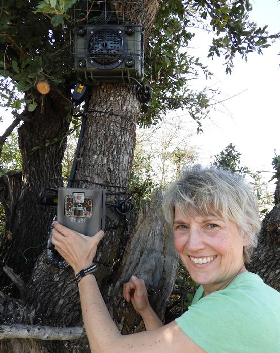 Western University professor Liana Zanette sets up an automated camera-speaker system.